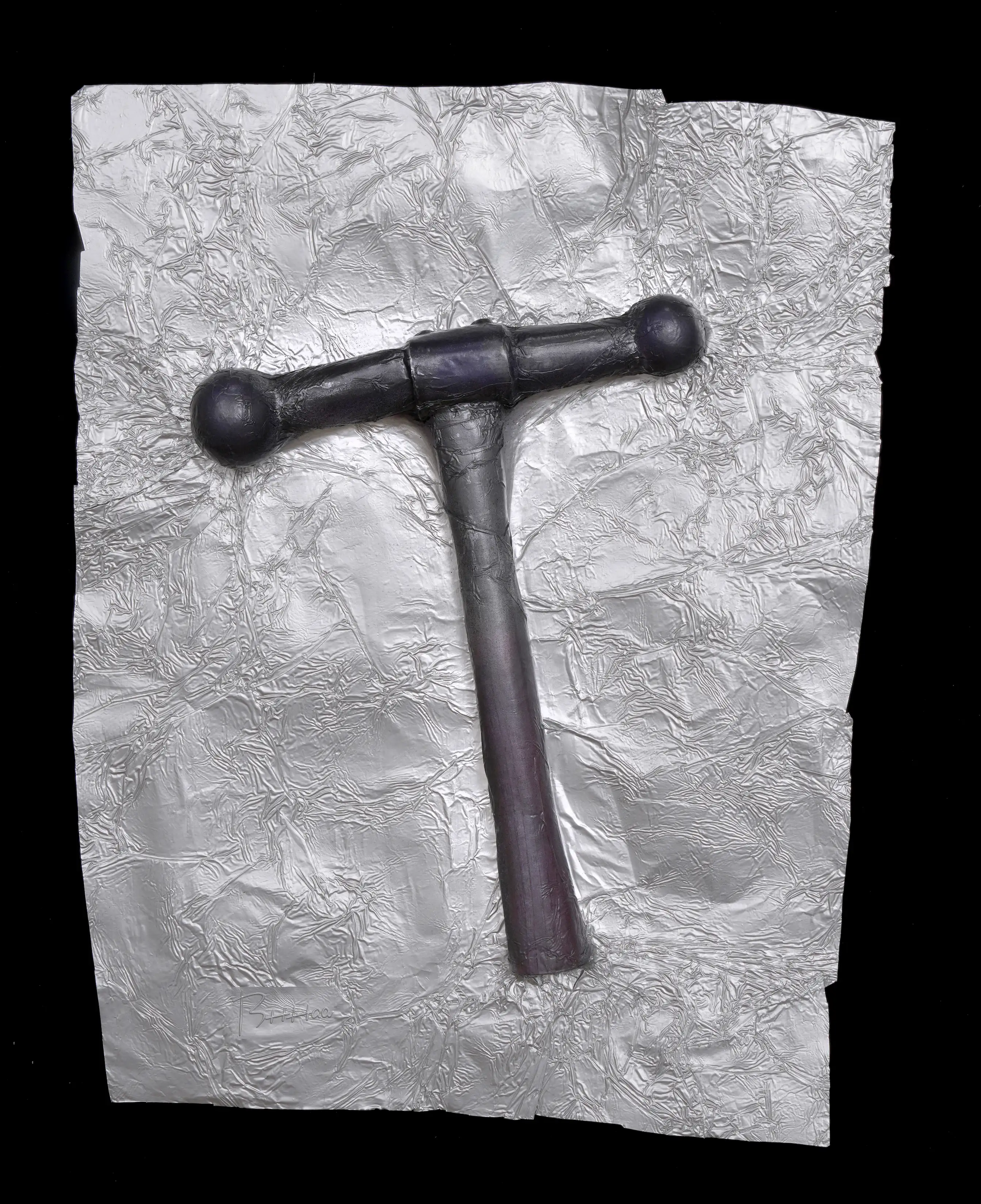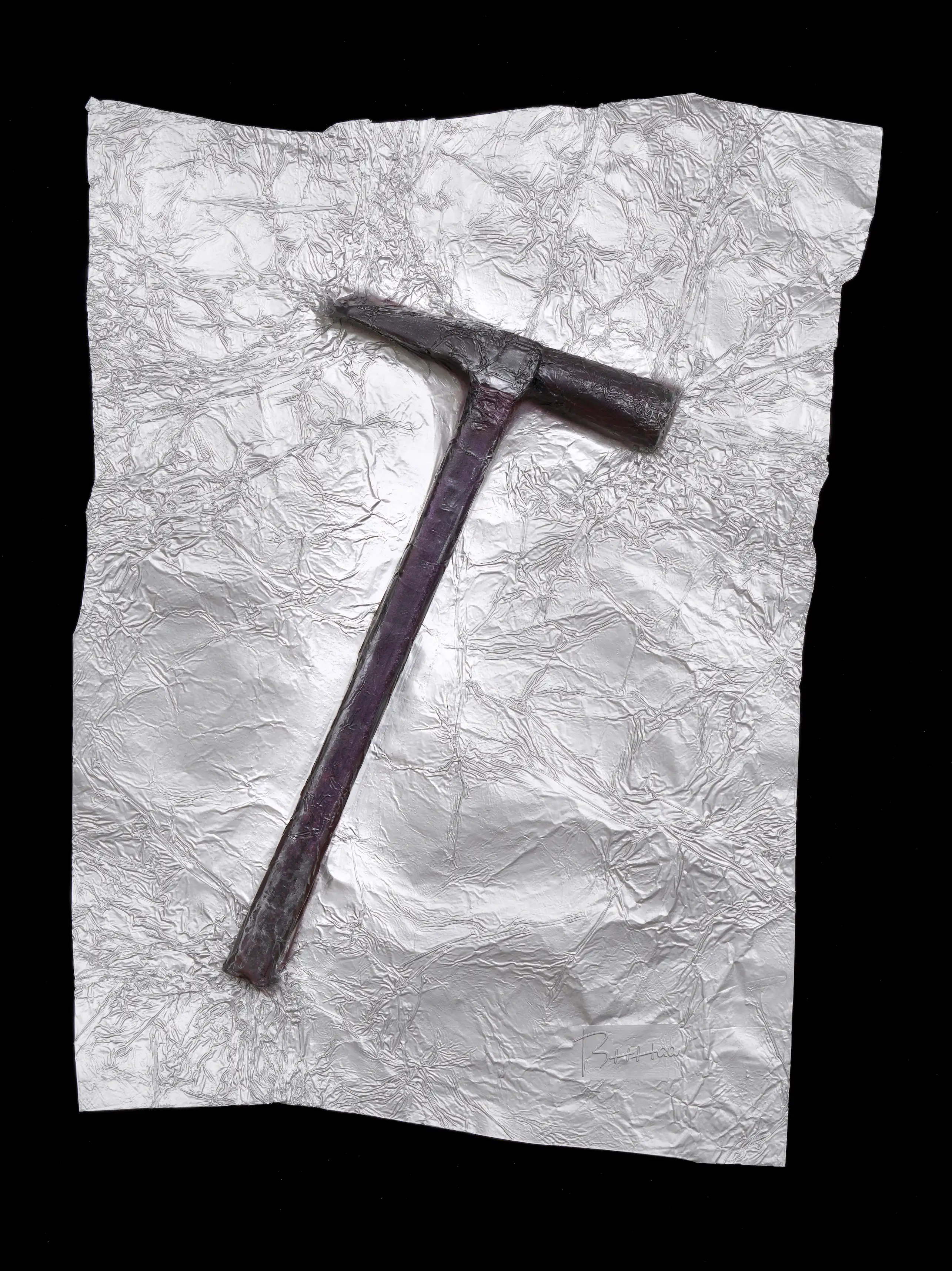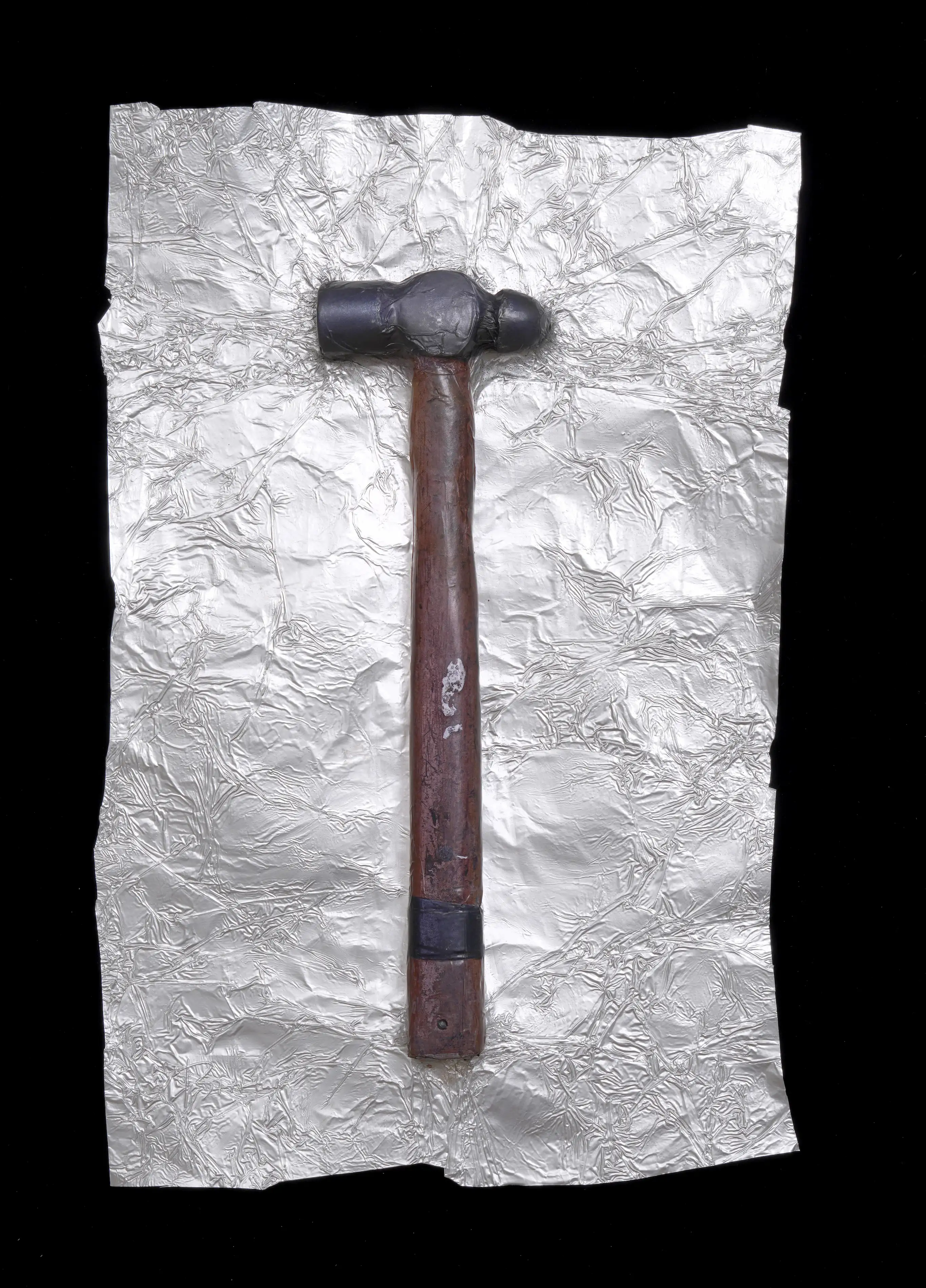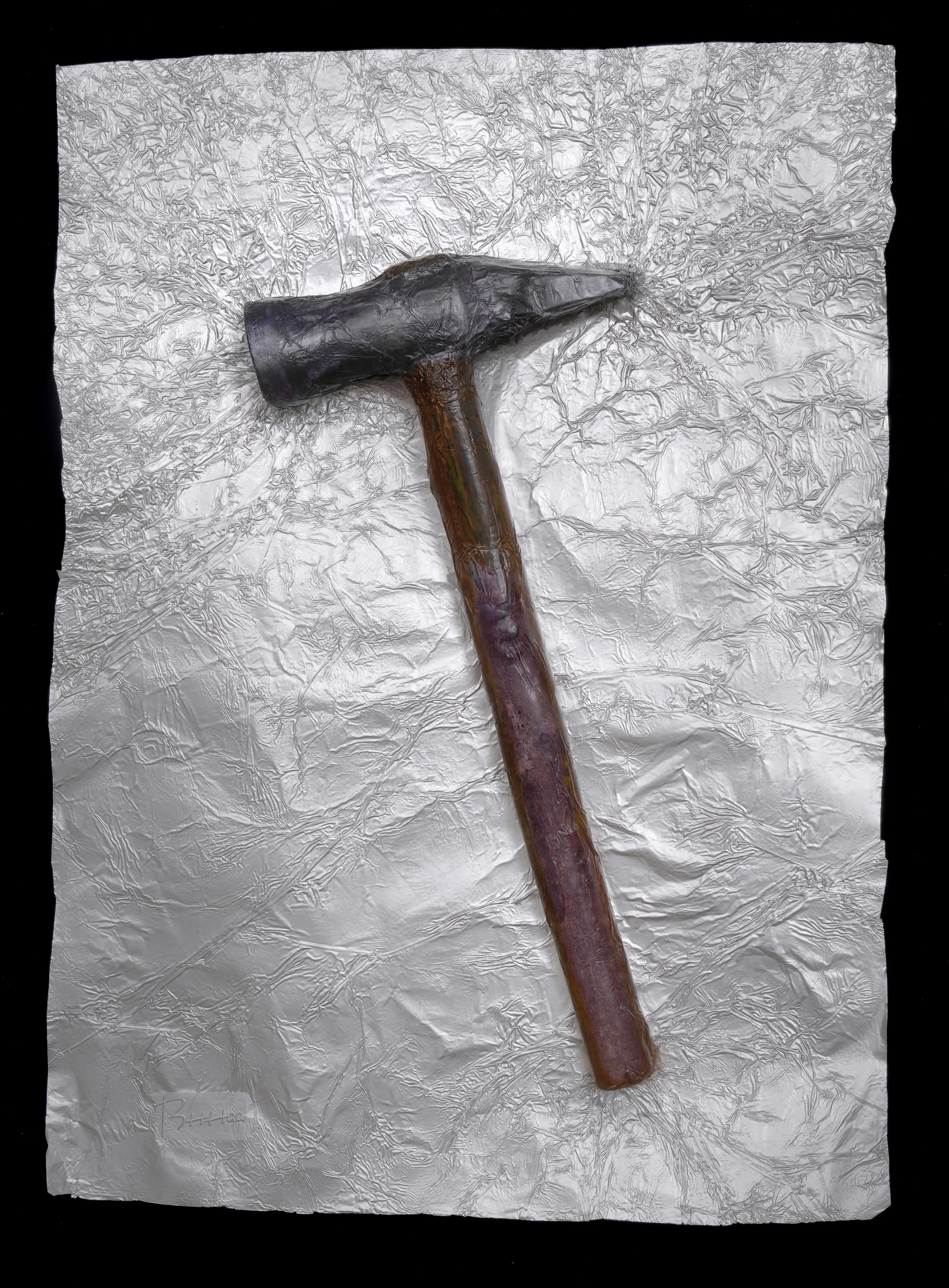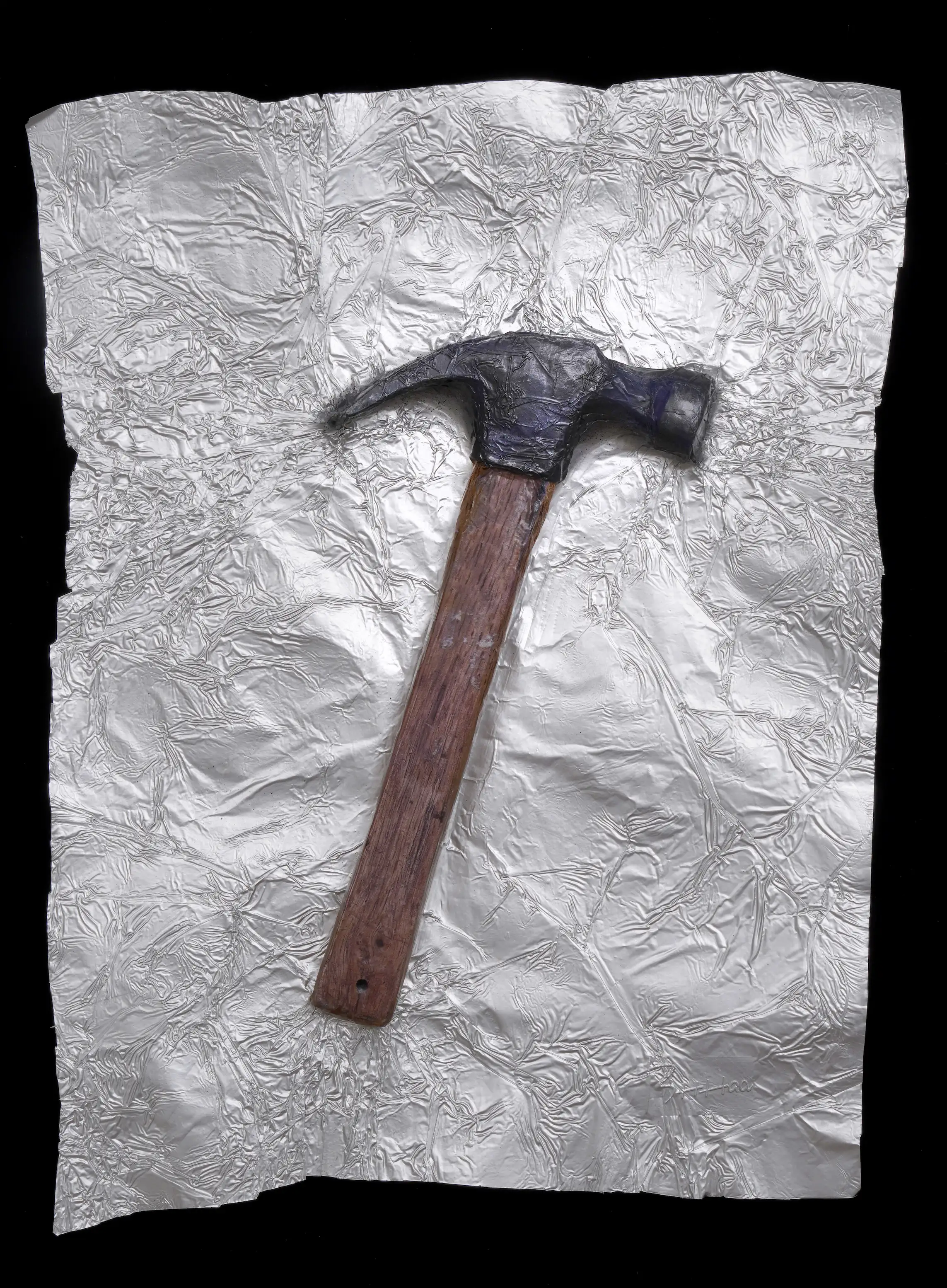 I use the image of a hammer, a tool shaped by labor and repetition, and print it directly onto crumpled aluminum foil. The material resists control. It bends, reflects, and records every touch. The photograph becomes unstable, no longer just an image, but an object.